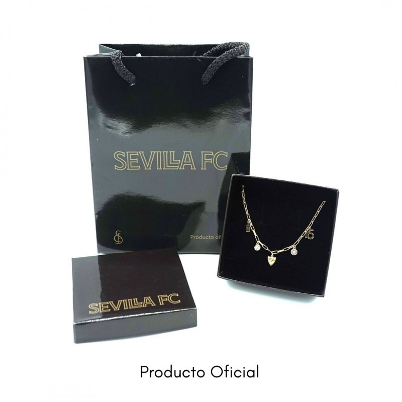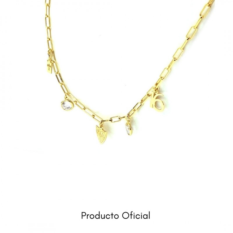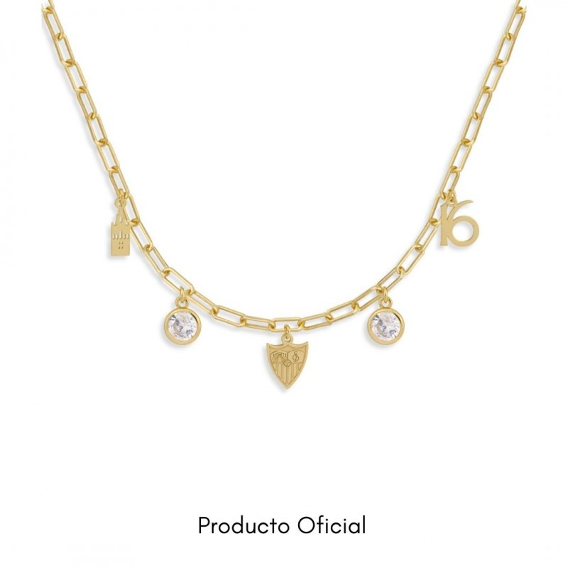Gargantilla de plata de ley bañada en oro con mini charms colgando; en el centro el escudo del Sevilla Fútbol Club, a un lado la Giralda y una piedra blancas brillante y al otro lado el número 16 y una piedra blancas brillante. Cierre de mosquetón.