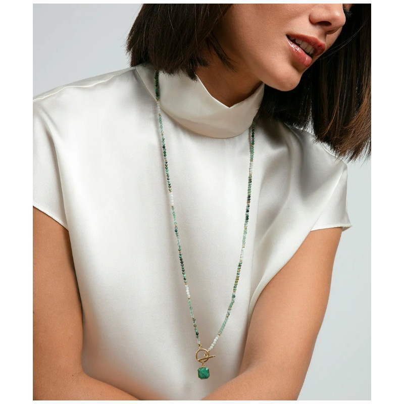 Con un diseño elegante y sofisticado, el acero IP dorado se combina con piedras naturales verdes y un delicado colgante, creando una pieza única y vibrante. Con un largo de 80 cm, ofrece la versatilidad necesaria para complementar tanto looks casuales como formales. Las piedras verdes aportan un toque de frescura, mientras que el colgante le da un detalle distintivo que resalta cualquier atuendo. Ideal para quienes buscan un accesorio con personalidad y un toque de elegancia.