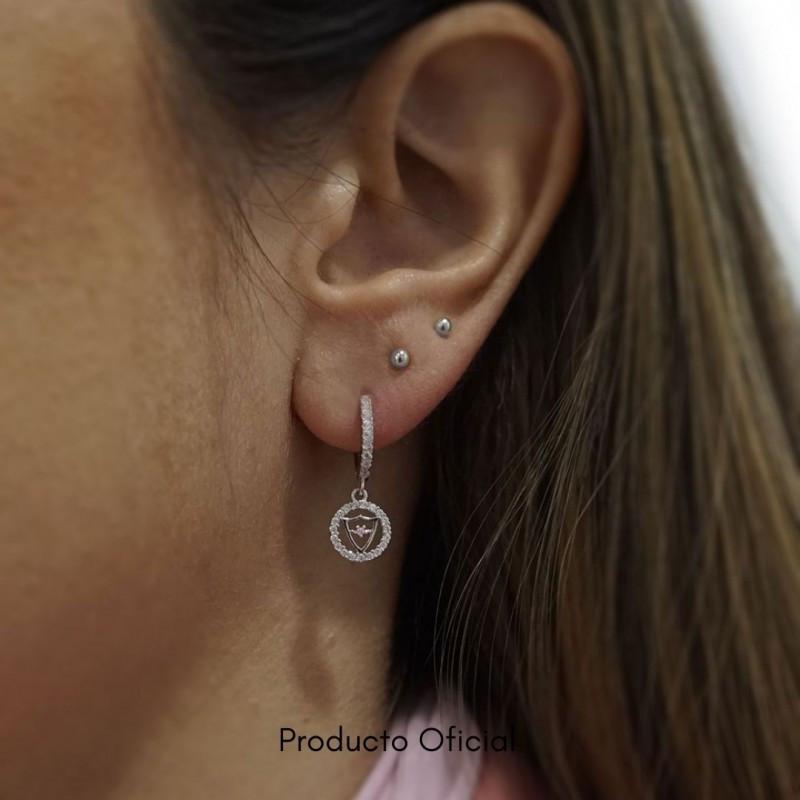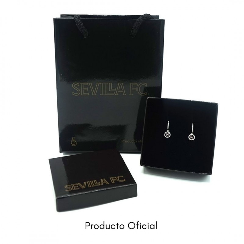 Argollas de plata de ley con circonitas blancas en la parte delantera y la silueta del escudo del Sevilla Fútbol Club con una circonita rosa colgando dentro de un circulo con circonitas blancas.