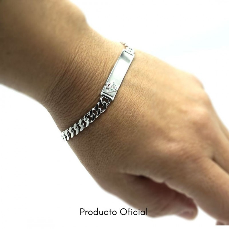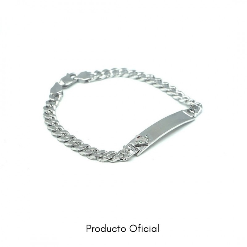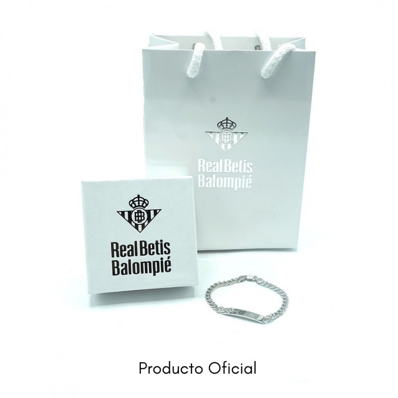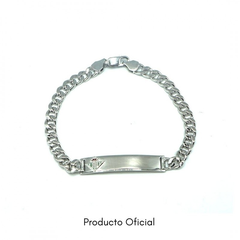 Esclava de plata de ley, con cadena de eslabones y placa rectangular lisa con el escudo del Real Betis Balompié a color dispuesto en el lateral de la misma. Cierre de mosquetón.