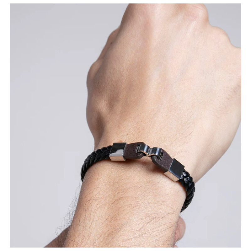 Esta pulsera para hombre, con su diseño de piel negra trenzada, incorpora motivos en piel verde que añaden un contraste elegante con los detalles en acero que brindan un toque de sofisticación. Esta combinación de materiales y colores crea una pieza única que resalta la personalidad y el gusto del hombre contemporáneo, convirtiéndola en un accesorio indispensable en cualquier colección de joyería masculina. Longitud: 21,5 cm.