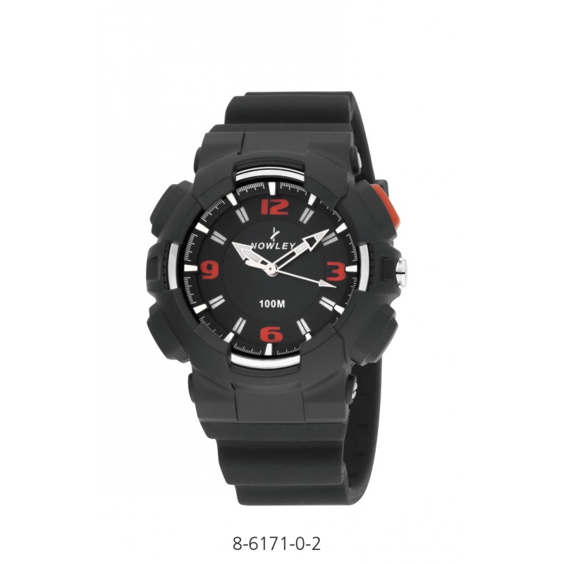 Reloj Nowley analógico Reloj cadete Medidas: 44 x 44 x 15 mm. Movimiento: Cuarzo japonés Impermeabilidad: 10 atm Caja: Policarbonato con bisel de acero Fondo: Acero inox con tornillos Cristal: Plex Correa: Silicona con hebilla de acero Antialérgico: 100% Garantía: 2 años Funciones: Horas, minutos, segundos, con luz, con linterna