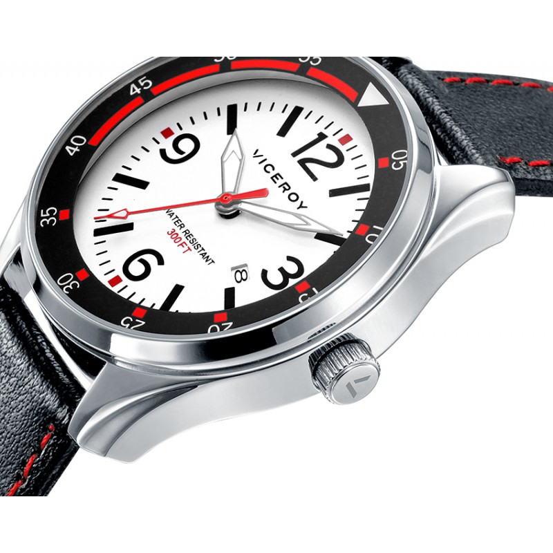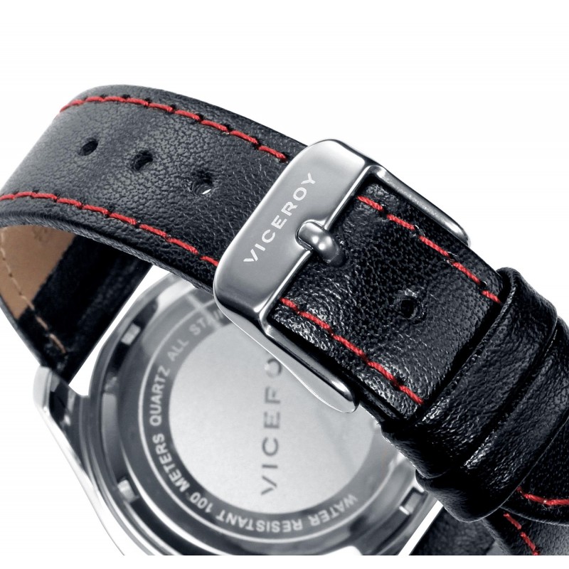 Reloj de niño Viceroy con caja de acero, esfera blanca y negra con números árabes más índices y correa con pespuntes rojos. Sumergible 100m.