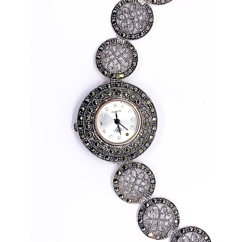 Este exquisito reloj de mujer combina la belleza atemporal de la plata de ley con un toque de elegancia vintage gracias a su acabado envejecido y las deslumbrantes marcasitas que adornan la esfera y la pulsera del reloj. Diseñado para la mujer que aprecia la sofisticación y la precisión, este reloj es una verdadera joya que añadirá un toque de distinción a tu estilo.