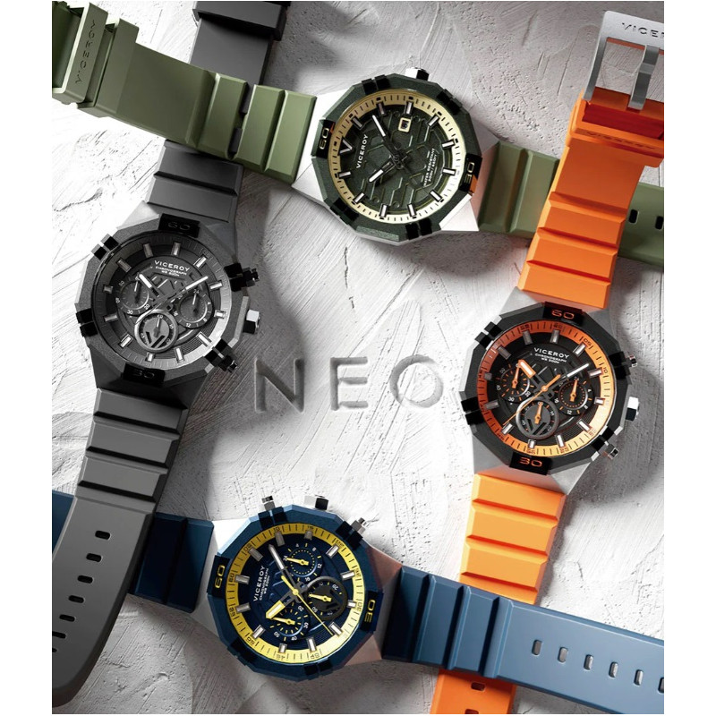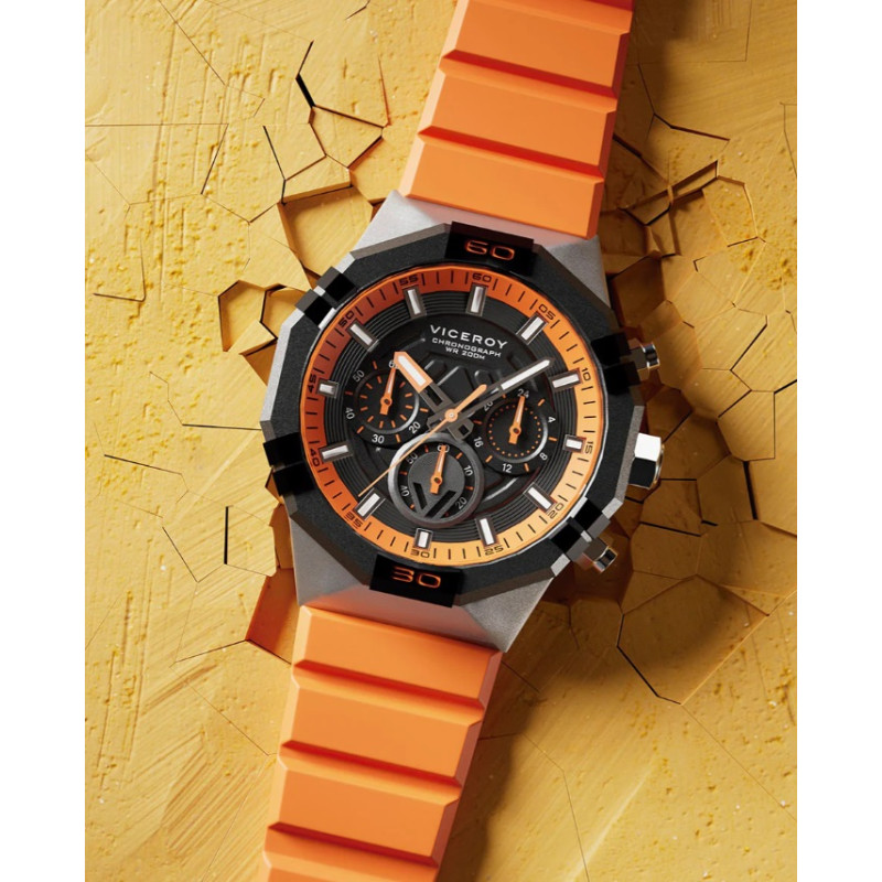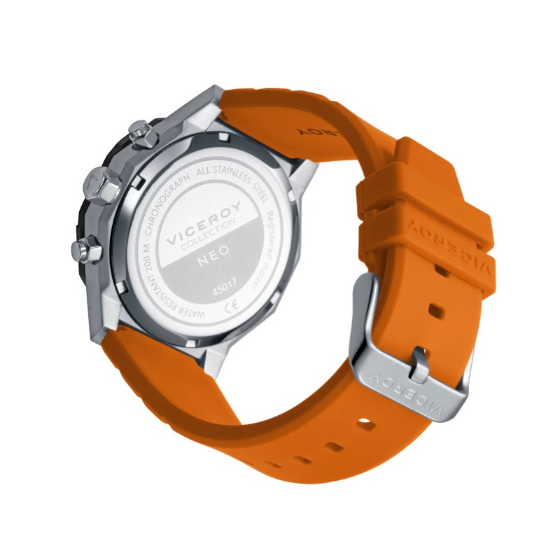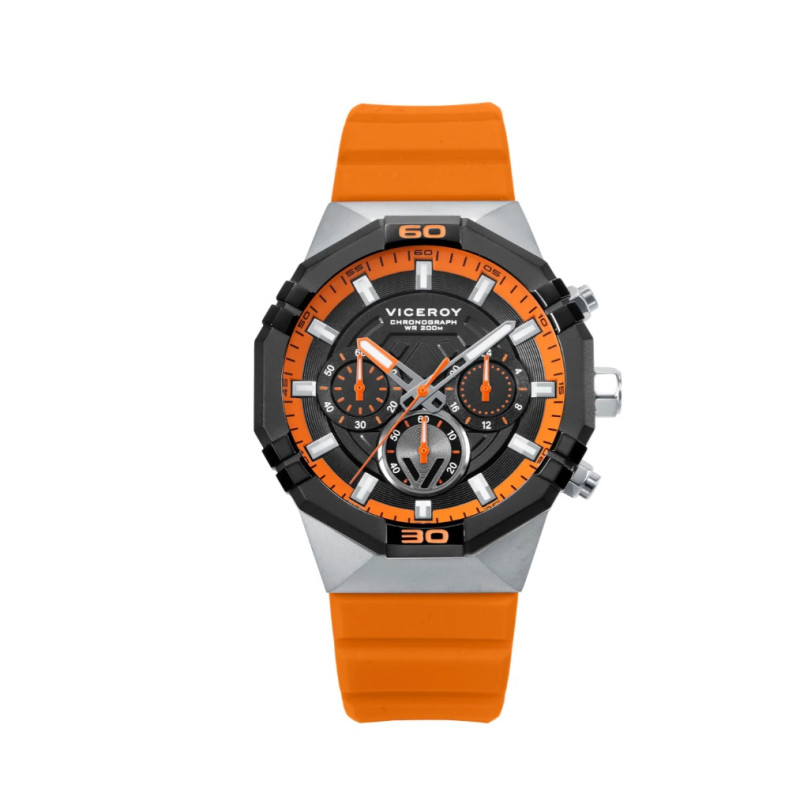 Con su caja bitono de acero negro, este cronógrafo para hombre se presenta como una pieza que mezcla sofisticación y carácter. La correa de silicona naranja le da un toque deportivo y moderno, creando un contraste vibrante con la esfera negra. Los índices en plata se complementan perfectamente con las agujas horarias en color plata, mientras que los detalles en naranja, como la punta de la aguja de horas y las agujas de segundos y contadoras, añaden un toque de dinamismo. Con cristal mineral y una resistencia de 20 Atm, ofrece la combinación ideal de estilo y funcionalidad para el hombre moderno.