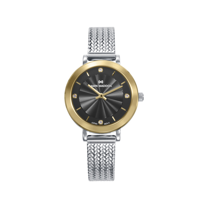 Elegancia atemporal para mujer con dos agujas, presentada en una caja bitono de acero e Ip dorado combinada con una malla milanesa de acero. La esfera negra resalta con índices y circonitas, mientras las agujas horarias en color Ip dorado aportan un toque de distinción. Un reloj que une estilo, sofisticación y funcionalidad, ideal para complementar cualquier look diario o de ocasión especial, manteniendo un acabado refinado y moderno.