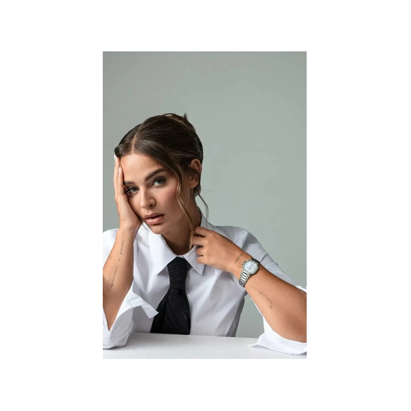Por último, el diseño de esfera minimalista y los cristales incrustados forman el sello distintivo que convierte esta pieza en una declaración de moda y estilo.