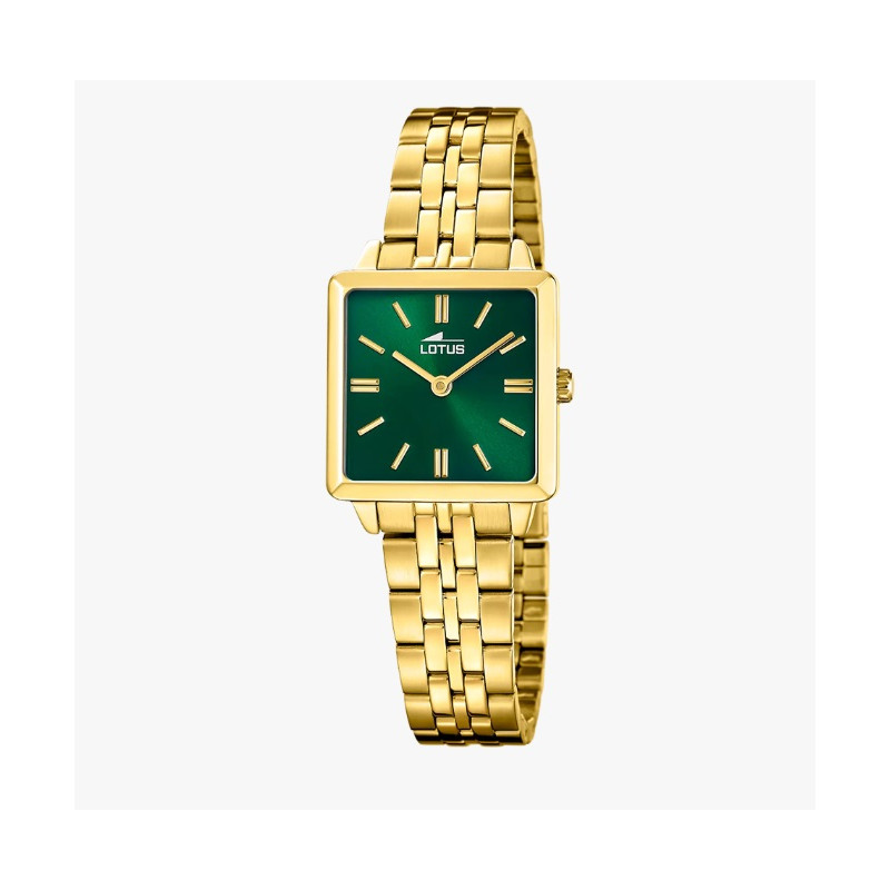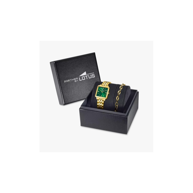 El Lotus 2Gether 19011/3 luce una sofisticada esfera verde enmarcada en una caja cuadrada de acero inoxidable, un diseño con personalidad elegante y atemporal. Acompañado de una pulsera a juego en su estuche regalo, este conjunto es ideal para quienes buscan un detalle exclusivo y con carácter Old Money.