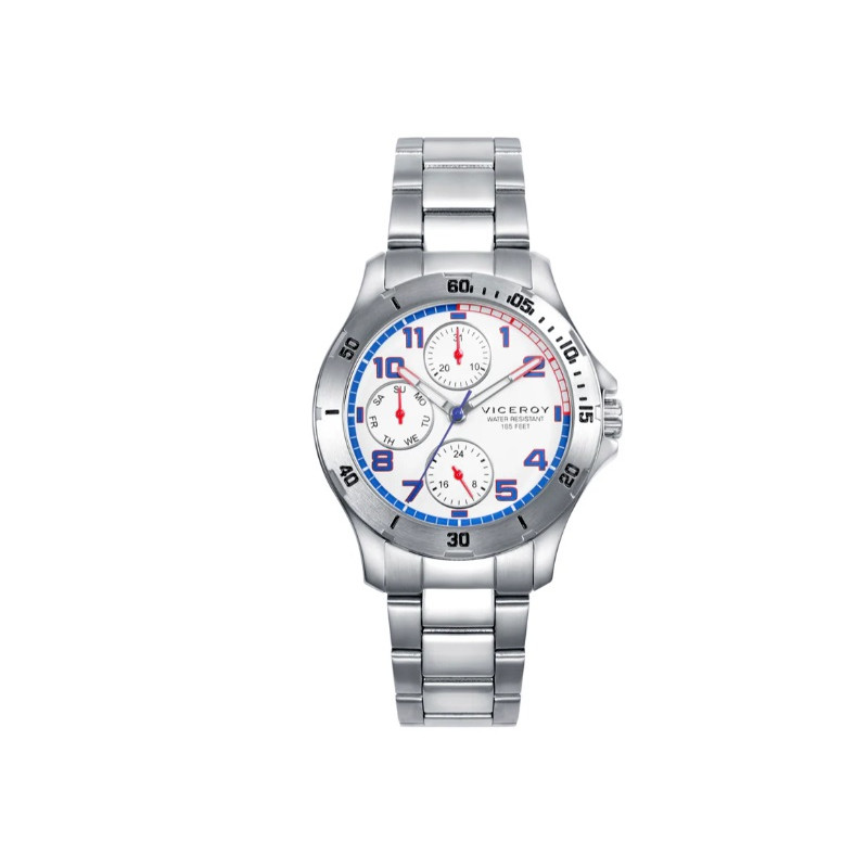 Regálale el complemento que necesita para brillar en su comunión. Este reloj de acero con esfera blanca, detalles rojos y azules en el bisel, y contadores a las 6, 3 y 9, lo acompañará a lo largo de su gran día y creará el mejor recuerdo de este importante paso en la vida. De regalo, una pulsera azul en piel trenzada con placa de acero y detalles esmaltados, cortesía de Viceroy para que su atuendo de comunión esté impecable.